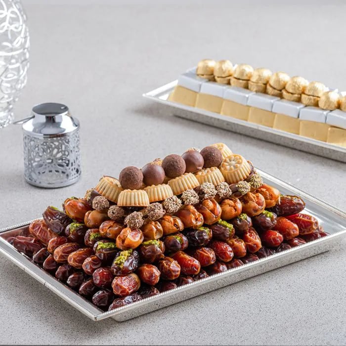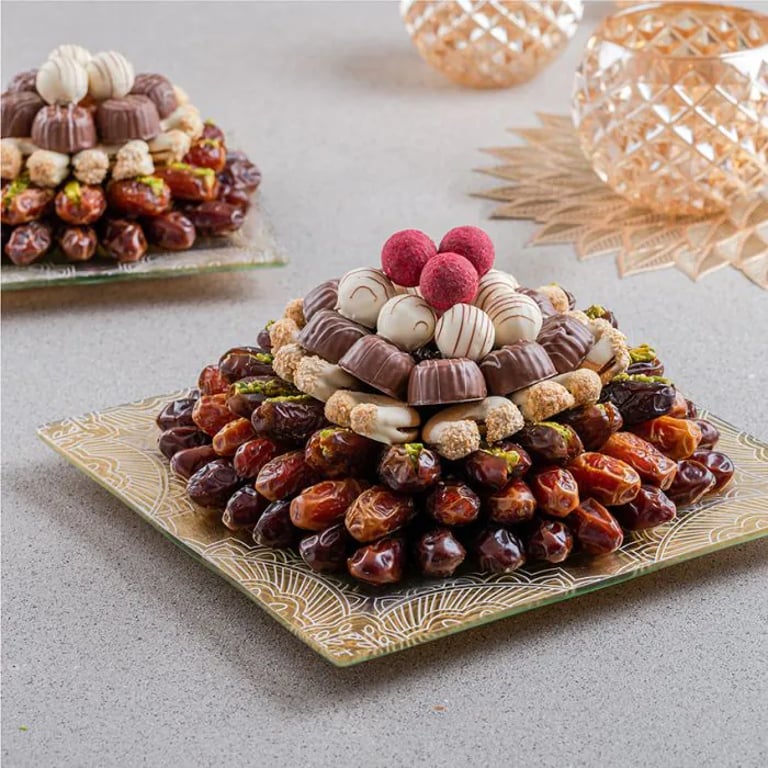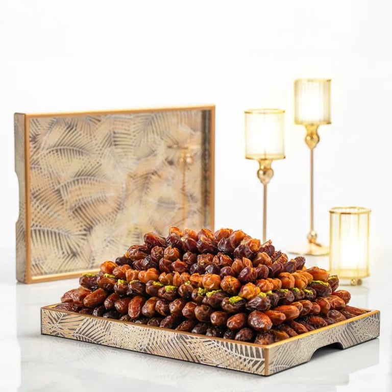 This beautifully handcrafted wooden tray showcases Bateel’s organic plain and gourmet filled dates. With its captivating gold palm leaf design and mirrored glass finish, the Nakhla tray is made from the finest materials, adding a touch of elegance to any setting.