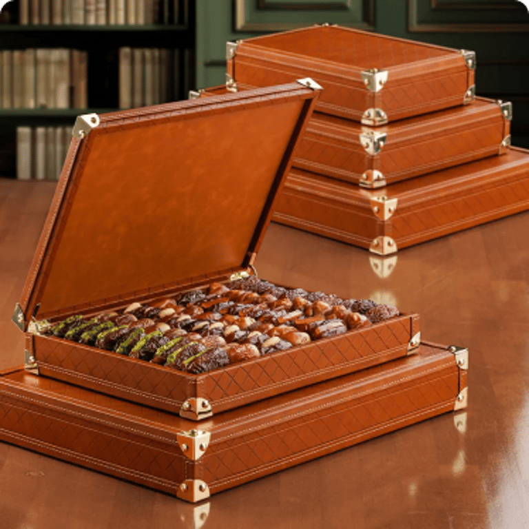 The design of this three-tiered gift set draws inspiration from the timeless elegance of date palm leaves, blending classic and opulent elements. Each tier presents a luxurious assortment of Bateel’s finest organic dates, carefully chosen to guarantee exceptional quality.